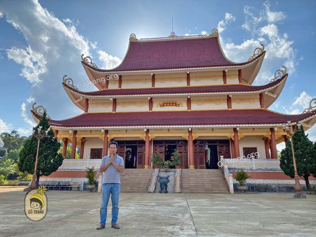 - Chánh Điện: Đây là công trình trung tâm, gây ấn tượng mạnh mẽ với cấu trúc ba tầng mái cong vút, được lợp ngói đỏ rực rỡ, nổi bật giữa nền trời xanh biếc. Kiến trúc chánh điện vô cùng tinh xảo và trang nghiêm. Đặc biệt, đỉnh mái được cách điệu theo kiểu mái nhà rông truyền thống của người dân Tây Nguyên, vươn cao kiêu hãnh lên bầu trời, như một biểu tượng của sự giao thoa văn hóa độc đáo.