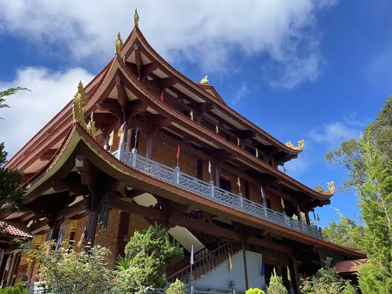 Giữa khung cảnh thiên nhiên hùng vĩ của Măng Đen, một viên ngọc quý về du lịch tâm linh mang tên Chùa Khánh Lâm hiện lên đầy trang nghiêm và thanh tịnh. Tọa lạc tại Xã Măng Đen, Tỉnh Quảng Ngãi, ngôi chùa này là điểm đến không thể bỏ qua cho những ai muốn tìm về chốn bình yên. Được khởi công xây dựng vào ngày 7 tháng 3 năm 2012 và hoàn thành sơ bộ sau hơn 5 năm (vào năm 2017), Chùa Khánh Lâm là sự kết hợp độc đáo giữa kiến trúc truyền thống và bản sắc văn hóa Tây Nguyên.