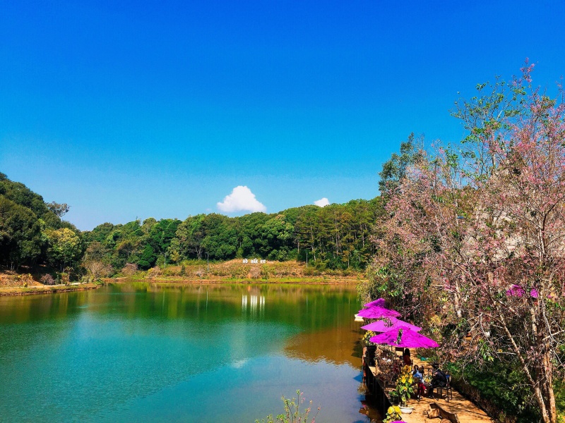 | Không gian Hoang Sơ và Xanh Mát | Hồ nước trong xanh giữa rừng cây bạt ngàn, tạo cảm giác yên bình, thư thái. |